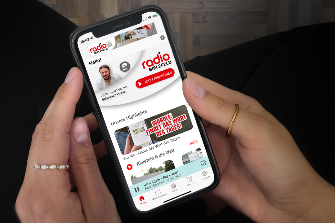 Auf der Startseite werden die User beim Öffnen der App nicht nur direkt mit einem Lächeln der Moderatoren begrüßt, sie können ihnen jetzt auch unkompliziert eine Sprachnachricht inklusive Fotos und Videos schicken. Dafür müssen sie einfach nur auf die Sprechblase klicken. Neben dem direkten Draht ins Studio können die User hier aber auch die Wetterlage der nächsten Stunden checken oder die aktuellsten Lokalnachrichten nachlesen und mit nur einem Klick auch nachhören. Und wer darüber hinaus wissen möchte, was außerhalb des eigenen Kreises oder der Stadt Bielefeld wichtig ist, der wechselt einfach zum Radio-Tab und hört in die aktuellste Ausgabe der Weltnachrichten rein. Damit und mit den Push-Nachrichten, die bei Sonderereignissen direkt aufs Handy geschickt werden und durch die neue Klick-Funktion noch mehr Informationen bieten, sind die User immer Up-to-Date.